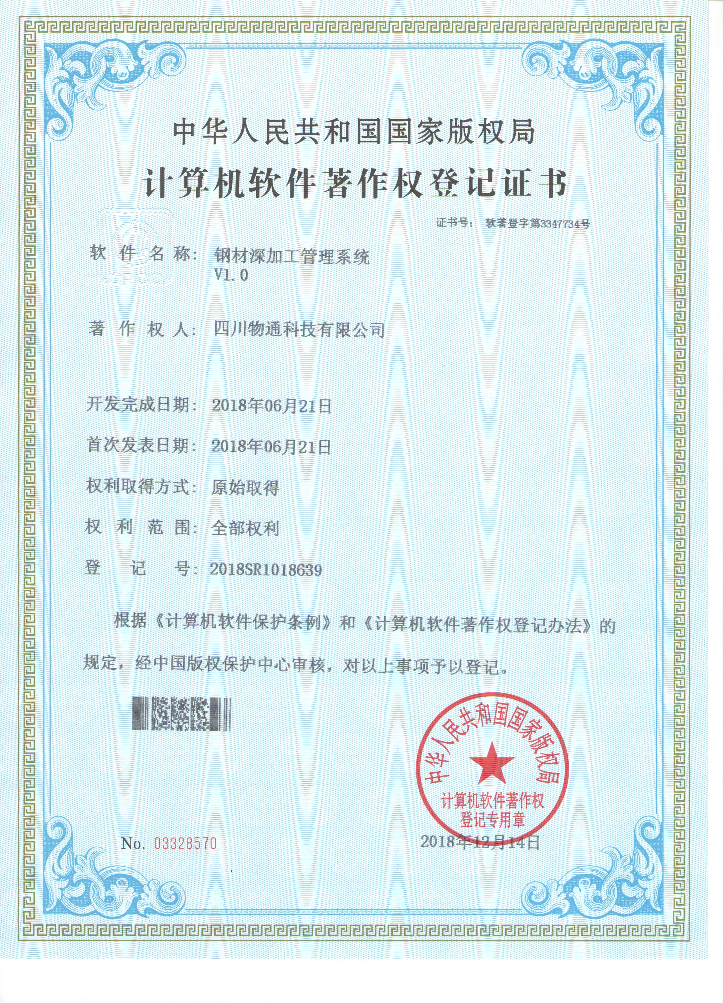 四川物通科技集團(tuán)有限公司技術(shù)部成功申請三項(xiàng)計(jì)算機(jī)軟件著作權(quán)登記證書:《鋼材深加工管理系統(tǒng)》、《基于客戶應(yīng)用信息處理技術(shù)的數(shù)字化倉儲物流...